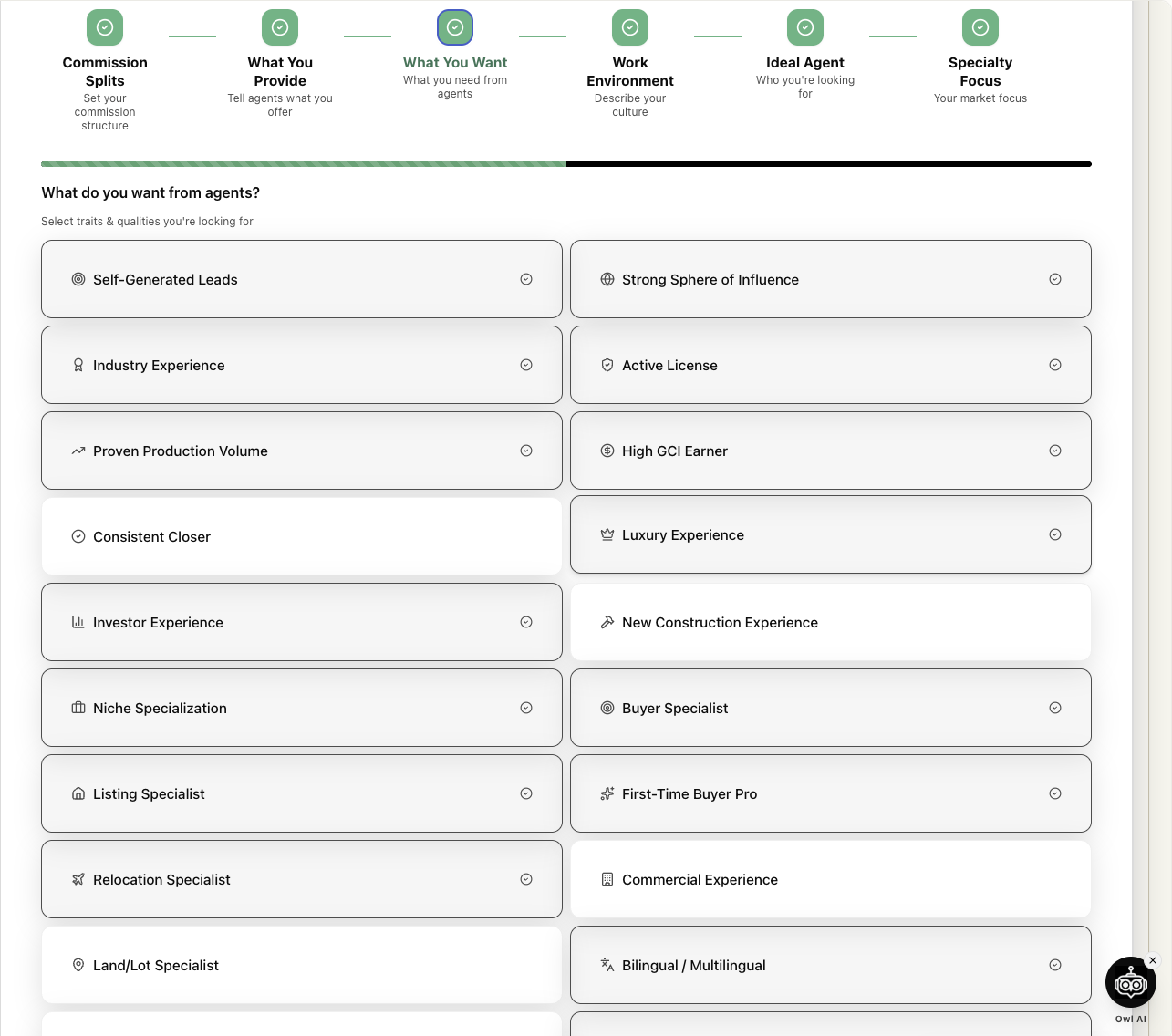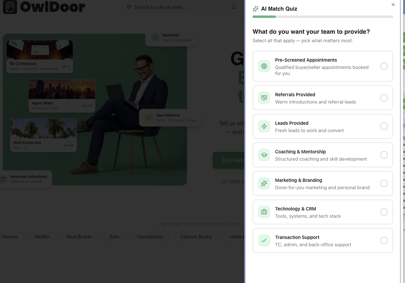 OwlDoor's matching engine starts with a guided quiz — agents and teams describe what they actually need, not just what looks good on paper.